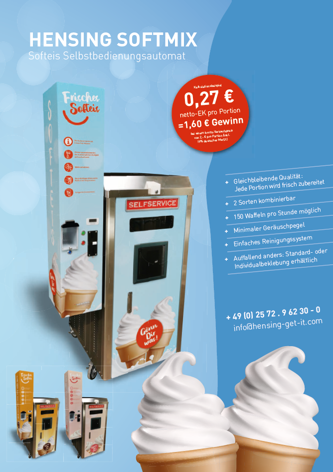 | Wenn die Temperaturen steigen und die Tage länger werden, erhöht sich in der Regel auch unser Eiskonsum. Verschiedene Sorten an Milch- und Wassereis können sowohl an Eisdielen als auch in jedem herkömmlichen Supermarkt erworben werden. Für Softeis gilt letzteres meist nicht. Hier haben Eisdielen ein Monopol. Bis jetzt! Denn mit dem Hensing Softmix lässt sich das vor allem im Sommer heiß begehrte Softeis im Automaten vermarkten – und das rund um die Uhr. Profitieren auch Sie! | (Bild anklicken) |